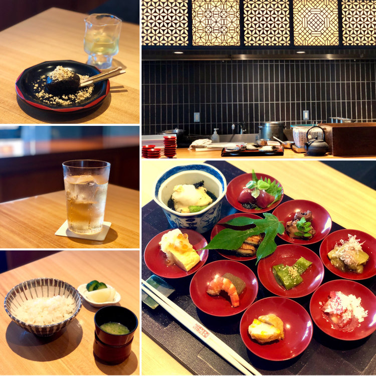 マグロ、タコのやわらか煮、焼きなす、熟成トマト、万願寺とうがらしのおひたし、鰻、出汁巻、たき合わせ、自家製さつまあげ、胡麻豆腐の揚げ出し