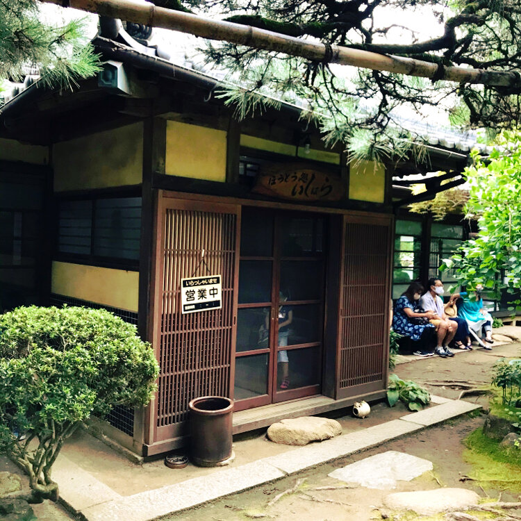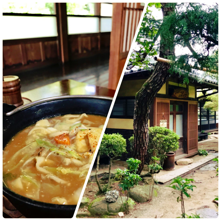 古民家の佇まい、縁側の外のお庭の緑を眺めながらいただくほうとう最高です。