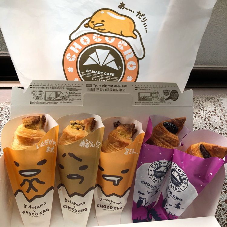 ぐでたまコラボのチョコクロ 久しぶりにサンマルクに行くといました、ぐでたまが。 八天堂にもいたし、最近流行ってるのかな? 包装は何パターンかあり、ちょっと心を揺さぶられた3つを。 味はプリン味。普通においしかったです。 普通のチョコクロもハロウィンバージョンになっていて、行くなら今の時期がオススメです!