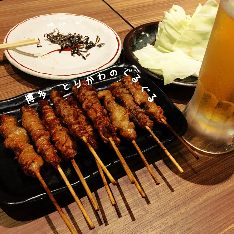 〈竹乃屋 別館〉サクラマチ3F 博多のとりかわが食べられます😋 10本1200円🍺ビールはサントリー 断れるお通し250円
