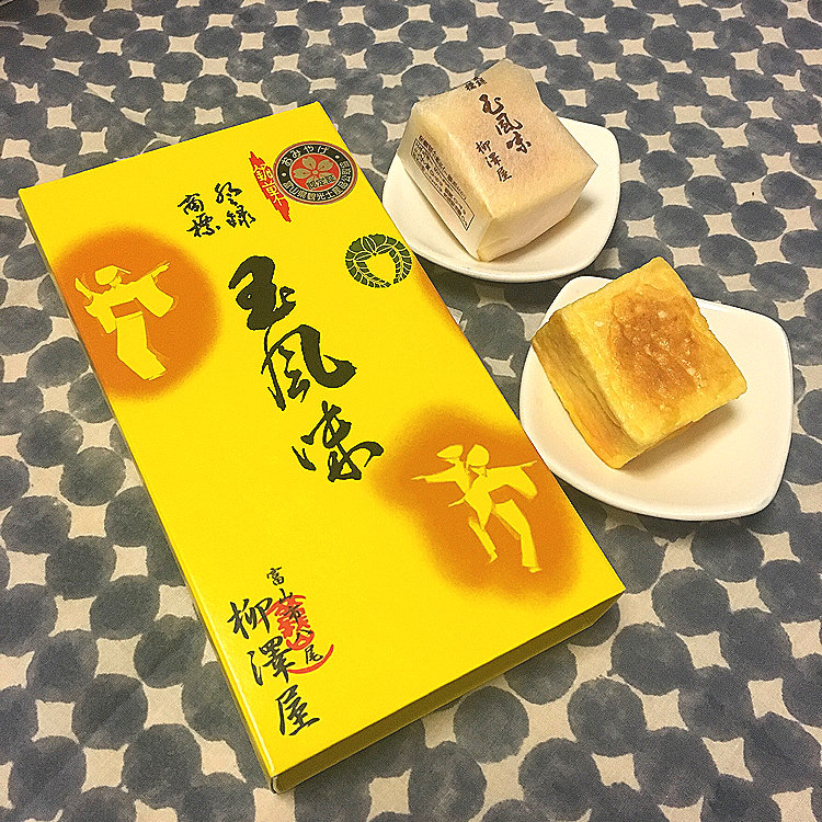 越中おわら風の盆の地元、八尾(やつお)の和菓子で卵白を泡立てて寒天で固め、周りに卵の黄身をつけて焼いてあります。しっとりふんわりとした食感と優しい甘さがお口の中で心地良く広がります。