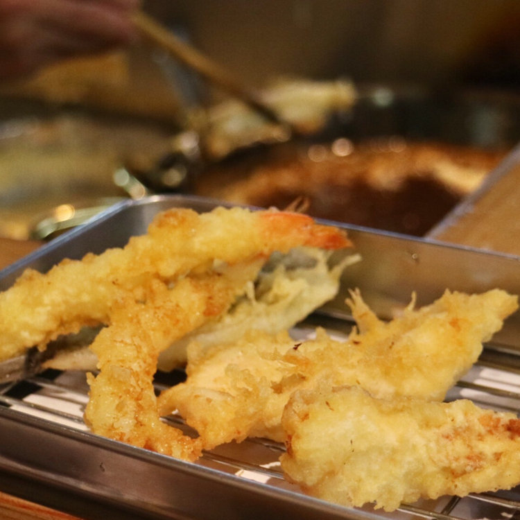 まずはナス、レンコン、ちくわ、オクラの天ぷらがやってきて食べていると、、店員さんが海老と穴子一本と半熟卵を豪快に追加😂
