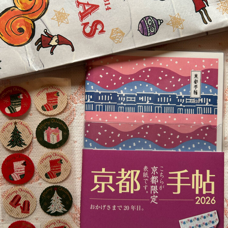 雑貨を色々見て、娘はショッピングバッグとパスケース、私はクリスマスラッピング用のシールと来年の「京都手帖」(地元京都の編集部で、編集・制作。京都の情報満載で「今日京都で何がある?」が一目でわかるスケジュール帳)を買いました。竹笹堂の版画デザインの京都限定版表紙(「雨模様」と「雪降る町家」のリバーシブル)、最後の1冊でした。この日はラス1のセーフ続きで、ラッキーな1日を締めくくりました。