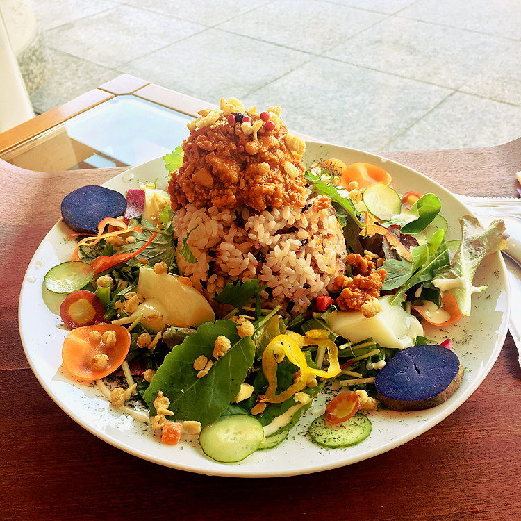 古代米の上にはたっぷりひき肉のピリ辛キーマがこんもり、そして周りには地産のお野菜がたっぷり添えられています。その中にある白いもの…何と杏仁豆腐でした😆