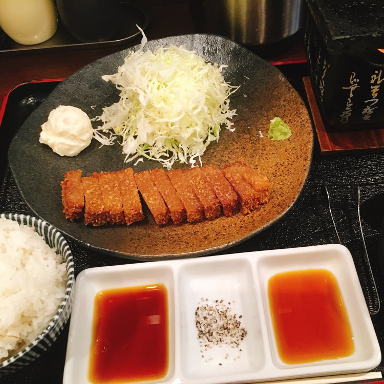 レアな牛カツと一緒に焼き石がついてくるのでお好みの焼き具合に自分で調整できます。味付けは麺つゆ、わさび、胡椒、ポン酢がついてくるので味に飽きずにどんどん食べられます。キャベツが沢山ついてくるのも嬉しいですね!