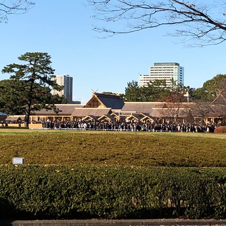 大嘗宮 途中断念組の写真 皇居の大嘗宮一般的参観 令和元年秋季皇居乾通り一般公開に 無謀にもチャレンジいたしましたが😅 乾通りの紅葉を満喫し 大嘗宮まであと少しのところから 「ここから大嘗宮まで80分」の 案内が⁉️ 予定もあったので タイムリミットもあり 断念😂 美しい青空と神々しい大嘗宮を囲む凄い人達の 遠い写真です💦 断念組からもよく見えましたー😅 #皇居 #大嘗宮