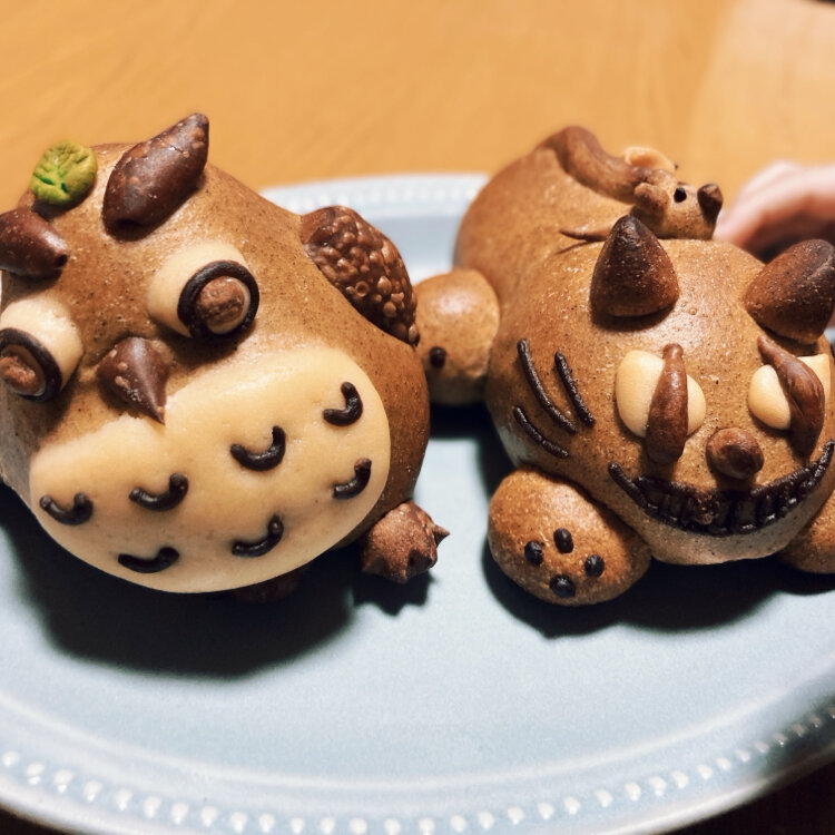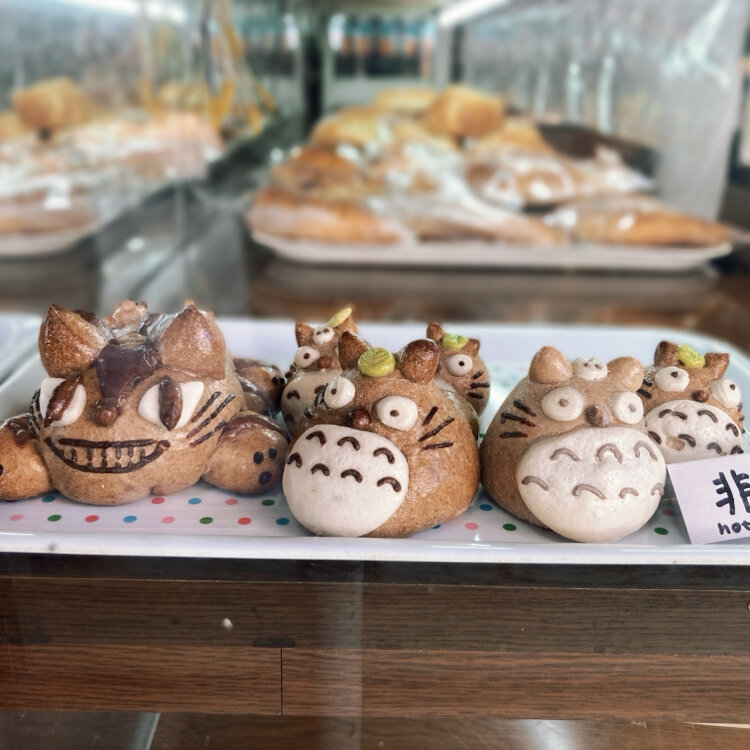 金沢市にあるレトロなパン屋やさん「パンブラザーズアベ」のショーケースに飾ってあるトトロとねこバスのパン🍞 非売品と書いてありましたが、店内にはねこバスとトトロっぽい?パンが売ってました🐈🚌🦉 #金沢 #石川 #金沢のパン屋さん #トトロ #ねこバス #かわいいパン