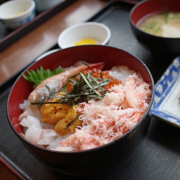 食事処かねまつのどんぶりメニューから『刺身丼』 ぶつ切りのお刺身、イカ、甘エビがてんこ盛りのどんぶりです。 あら汁は魚のダシがたくさん出てとても美味しく、お代わり自由です。 #福井県 #小浜市 #食事処かねまつ #刺身丼