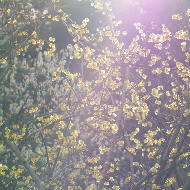 蝋梅❁⃘*.゚ いい香りが漂っています 午後の優しい陽を浴びて キラキラ✨️ 後ろには白梅❀.*・゚ 2023.02.12 京王百草園 #ファンタジーの世界 #Myことりっぷ #日野市#東京#百草園#梅#蝋梅