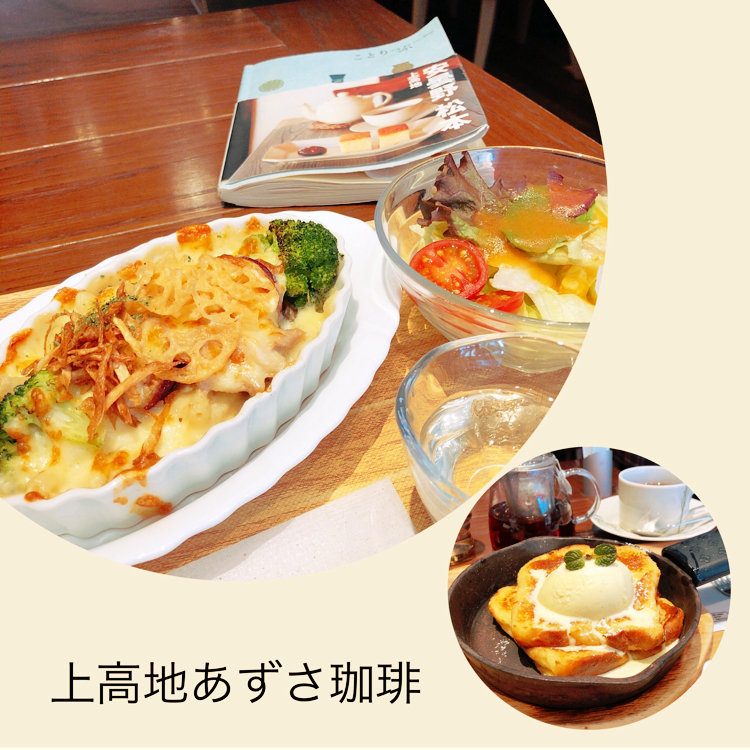 #上高地あずさ珈琲#八王子#ランチ 夢美術館のあと、ランチに入ったお店 スキレットで焼かれたフレンチトーストに魅せられて😍選んだのは 選べるスイーツと小さめごはんセット ごはんは、ミルクグラタン💕 ドリンクは、ポットサーブのアーグレイ ことりっぷ安曇野松本をお供にのんびり過ごせました