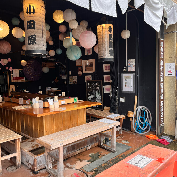 足湯に入りながら、お酒やかまぼこなどが楽しめる鱗吉。 雨が降っていて寒かったので温かい足湯がありがたかったです。 神奈川の地酒飲み比べや、炙り伊達巻きなどがありました。 伊達巻きを炙って食べたことはなかったので新鮮でした。甘さが凝縮して別の食べ物のようでした。 足湯は井戸水を使用されているそうですが、帰りに足を洗う用の水やタオルの用意もあり、心遣いを感じられました。 #小田原