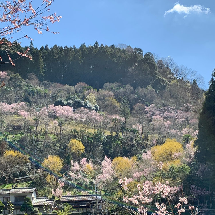 桃源郷と呼ばれるここは、ただいま花盛り🌸 黄色のサンシュユと啓翁桜が美しいです❣️ 思わずカメラマン気分でパチリ♫