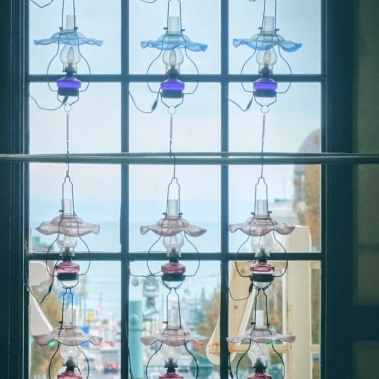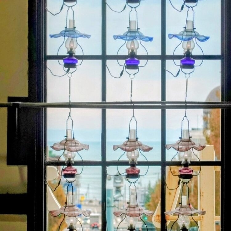 ガラスの街小樽を象徴する北一硝子の石油ランプが合計333灯、駅舎の窓を飾っています。