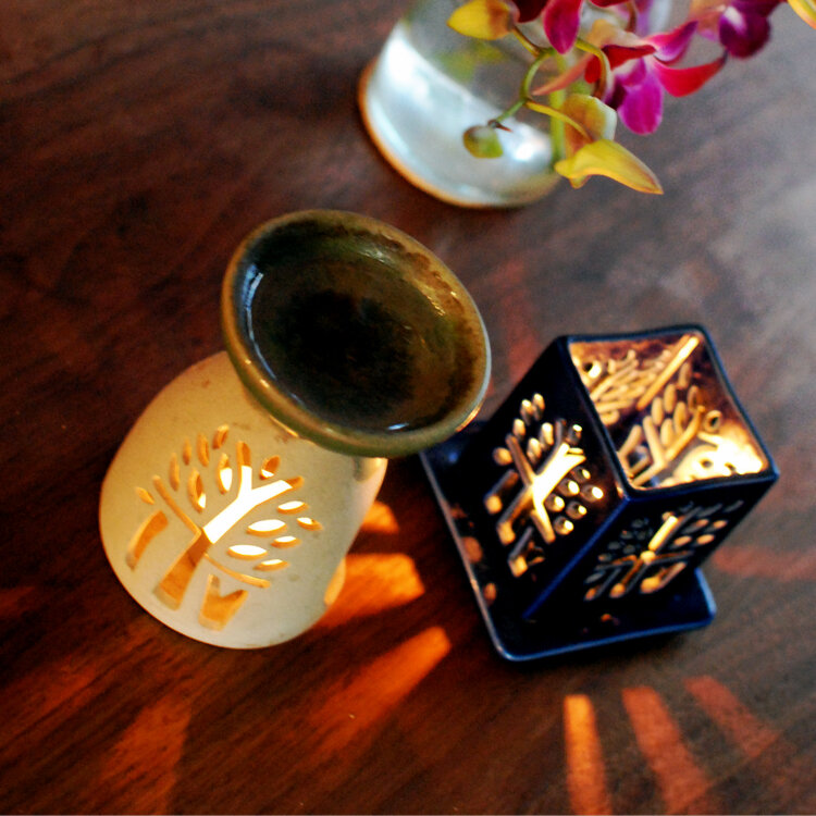 タイの旅の思い出の キャンドルホルダーと、アロマポットです。 Banyan Tree Bangkokで購入しました⭐︎ スパでもこのアロマポットが使われていました。 とても素敵なホテルで、良い旅の思い出です✨ ホテルの部屋に着いた時に迎えてくれた、 ウェルカムフラワーのジャスミンの花飾り、 今でもよく覚えています☺️✨