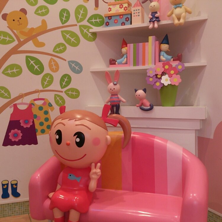 ピンク色のソファに座ったさっちゃんがピース✌️してて、一緒に記念撮影ができます。(トップ)