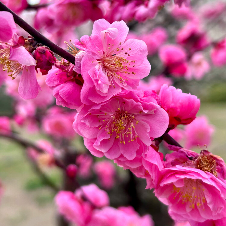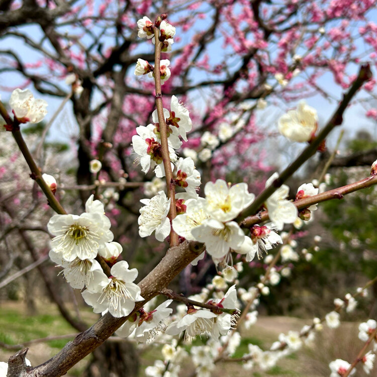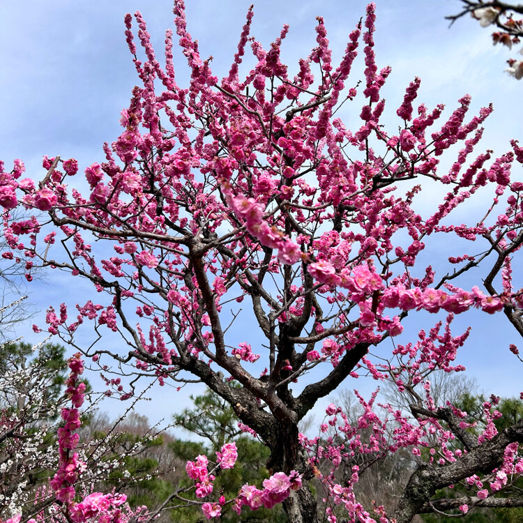 「万博記念公園」 *日本庭園 梅林 万博記念公園には、自然文化園の他に日本庭園にも梅林が有ります。 ワクワクミャクミャク像を見た後、すぐ目の前が日本庭園の入り口なので、梅を見に行きました。 「自然文化園」に比べて規模は小さいのですが、開花が遅めの品種が多く、「淋子梅」や「楊貴妃」が綺麗に咲いていました。 花数が多く、目の高さで華やかな梅のお花を見る事が出来ます。 #万博記念公園#日本庭園 梅林#淋子梅#楊貴妃#私の街の春#私のことりっぷ旅