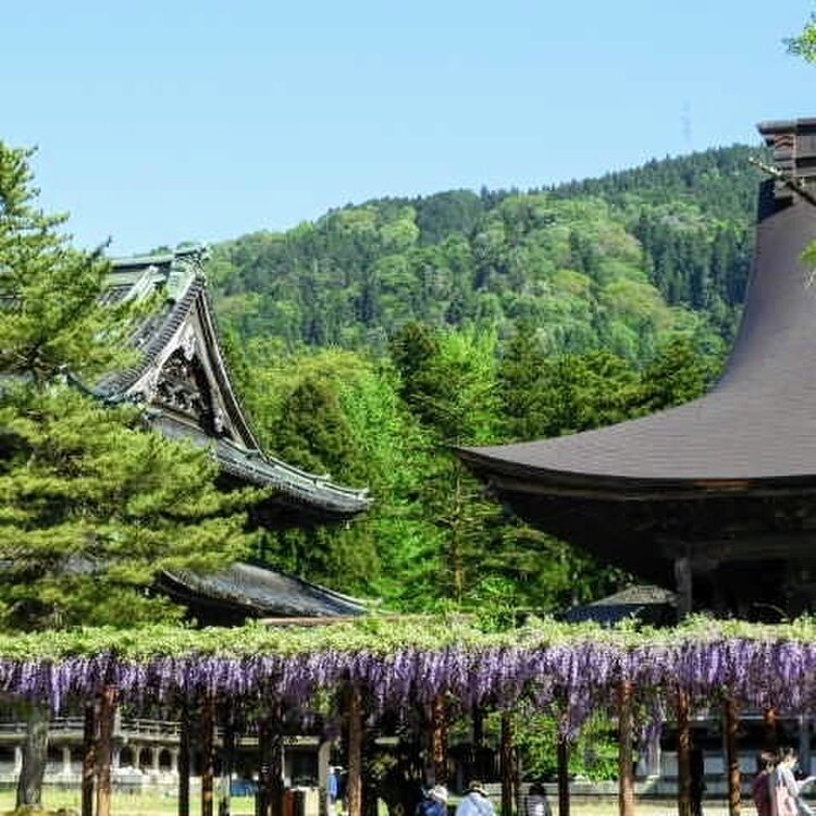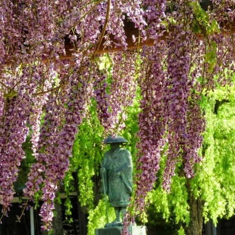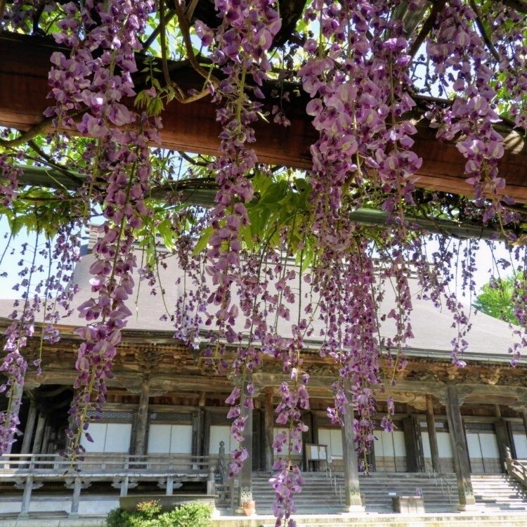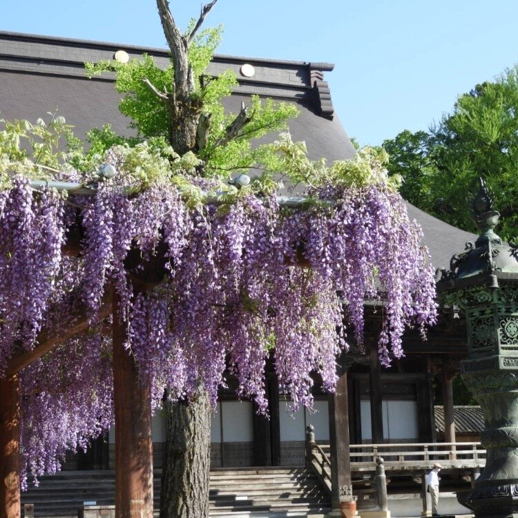 真宗大谷派井波別院【瑞泉寺】 今、藤が綺麗です❇ 時間短縮で無料で境内の藤を眺められます 井波は木彫刻の町 瑞泉寺は井波彫刻の粋といえる作がちりばめられています コロナの影響で中には入れませんでしたがそよそよとなびく藤がとても綺麗でした