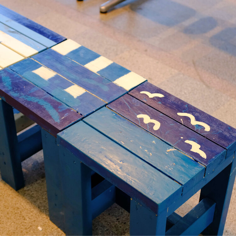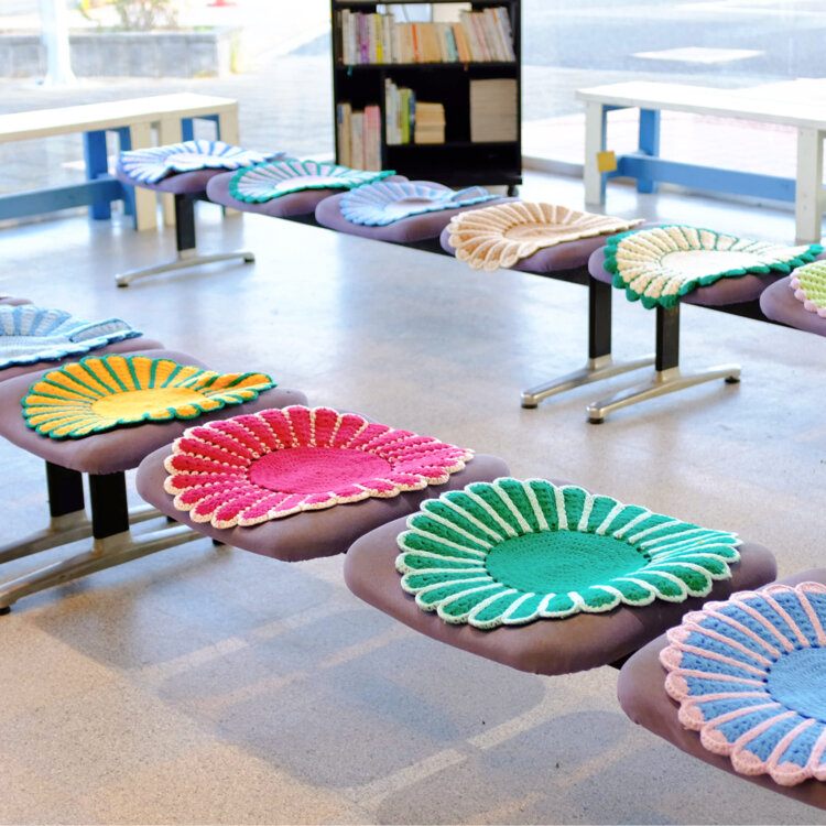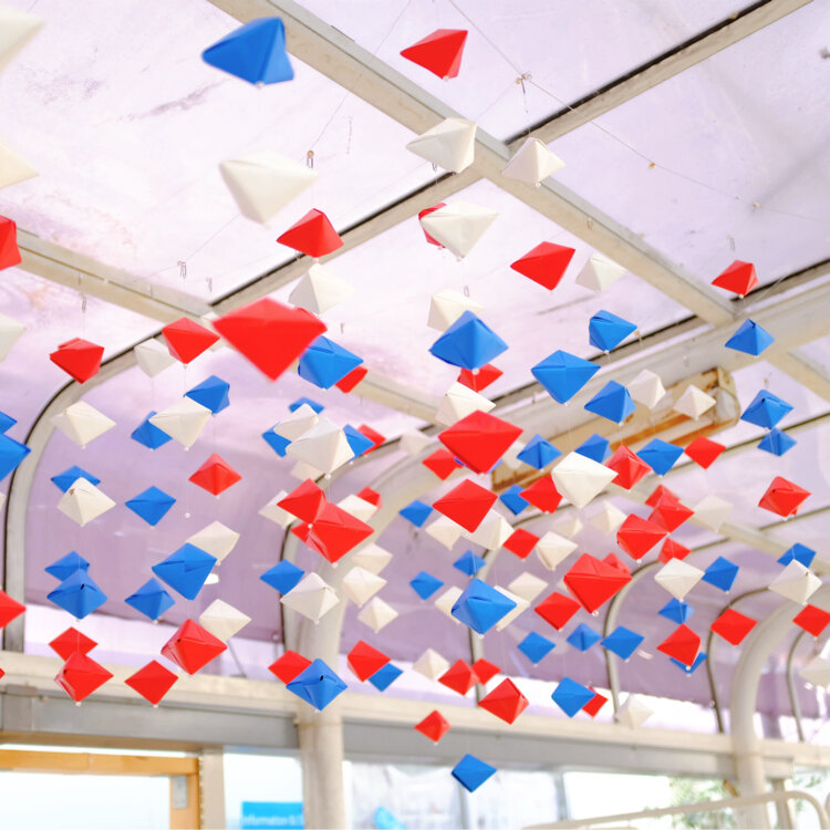その他、お土産屋さん前の天井の折り紙細工(画像3枚目)や、手作り&ペイントの椅子(画像4枚目)もあって、待合室全体がカラフルで可愛らしい~。船を待つ間もほっこり癒されます。