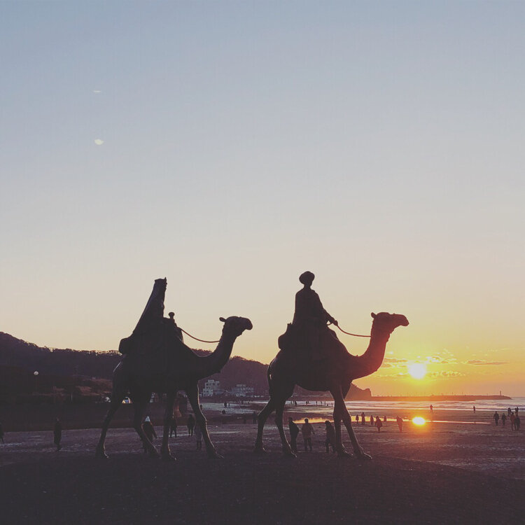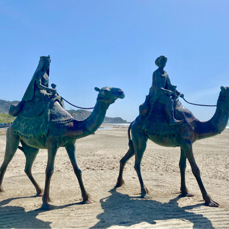 2018年の元旦に撮ったものです。 童謡"月の砂漠"の舞台となったとされている 御宿の海岸に2匹の銅像が立っています。