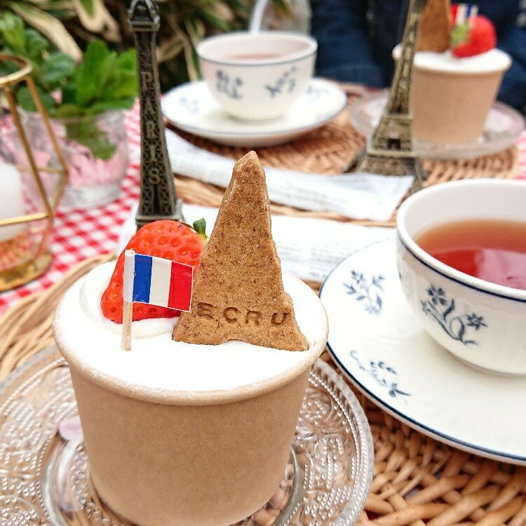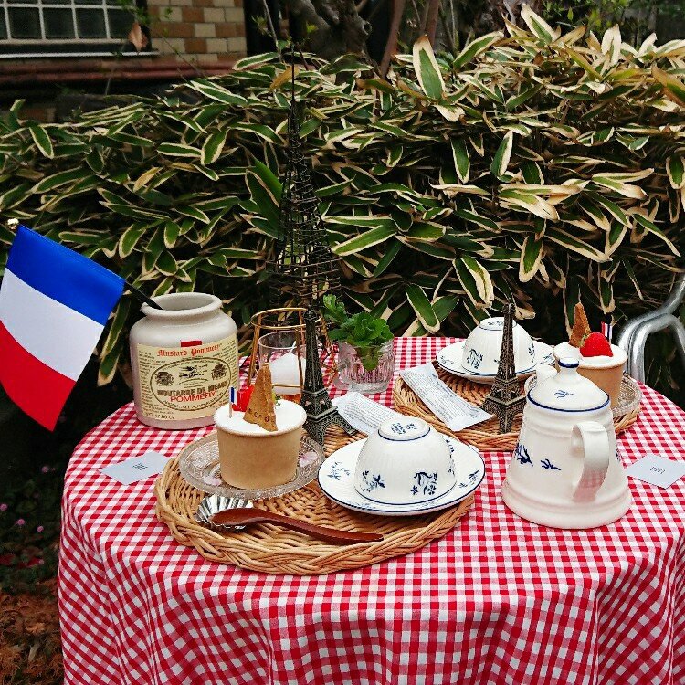 お庭でパリ気分🗼✨✨ zakka「ECRU」さんと、古民家の焼き菓子屋「ima」さんとのコラボのイチゴケーキと美味しい紅茶で……☕ 今まで庭でのんびりすることがなかったけれど、コロナ感染対策でたくさんのことを発見することができました✨