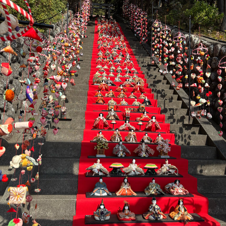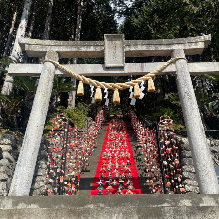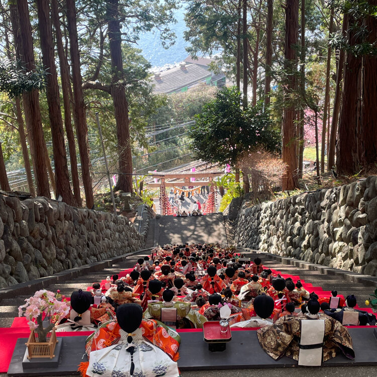 素戔嗚神社 雛壇飾り 2月14日から3月8日まで開催。 朝8時にスタッフの方が飾り、15時ごろに毎日しまっているそう。 鳥居の下でスタッフの方が写真を撮ってくださる。 管理費として鳥居手前にある賽銭箱にひとり300円を納める。 目の前には線路もあり河津桜と電車の素敵な写真もおさめられる🌸🚃 本殿へは山の上を登る必要がありますが、鳥居の近くで御朱印は販売されていました。 #素戔嗚神社#神社雛壇飾り#伊豆稲取