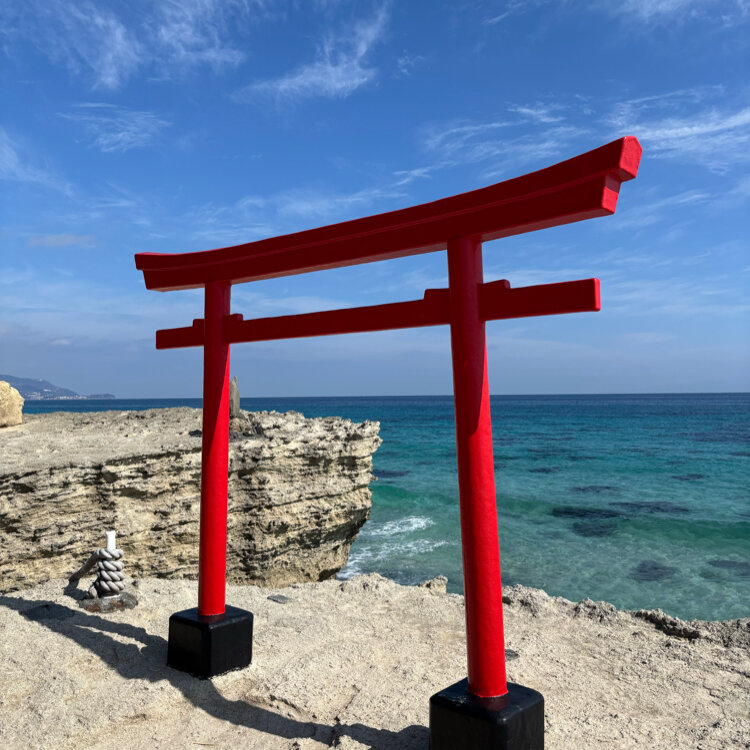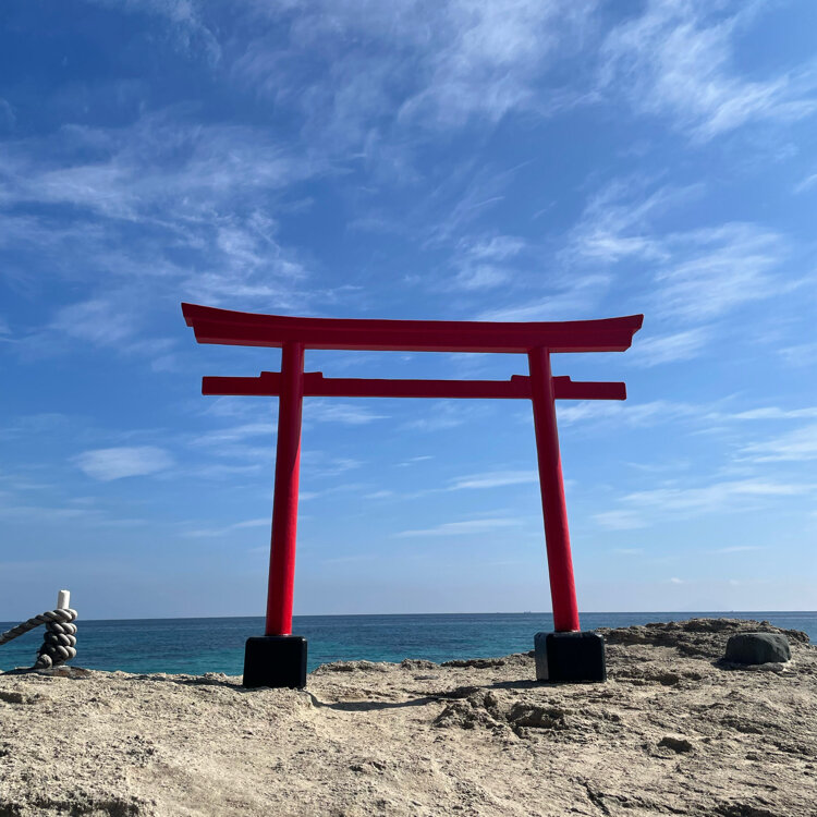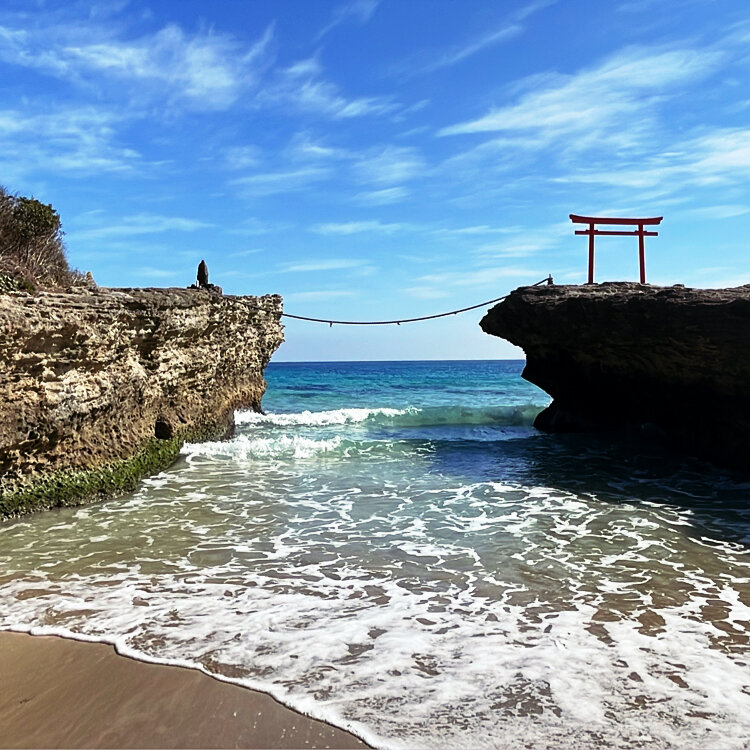 白濱神社(伊古奈比咩命神社) 伊豆下田の白浜海岸にある海岸鳥居⛩️ まずは海岸鳥居の方から参拝し、本殿へ向かうのが、正しい参拝ルート。 本殿へ向かう途中には心鎮め自分と向き合うためのお言葉が立てられています。 参拝を終えると清々しい気持ちになります。 #伊豆下田#白濱神社#海岸鳥居 #白浜