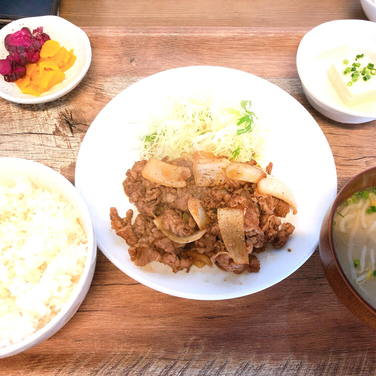 看板がかわいい食堂。 今日は焼肉定食をいただきました。 最後に黒胡椒をパラリと振ってパンチを出してます。 ご飯、生卵おかわり自由は嬉しいです。 #わたしの街