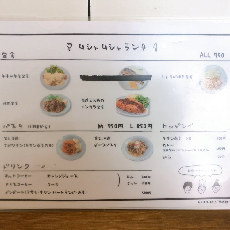看板がかわいい食堂。 今日は焼肉定食をいただきました。 最後に黒胡椒をパラリと振ってパンチを出してます。 ご飯、生卵おかわり自由は嬉しいです。