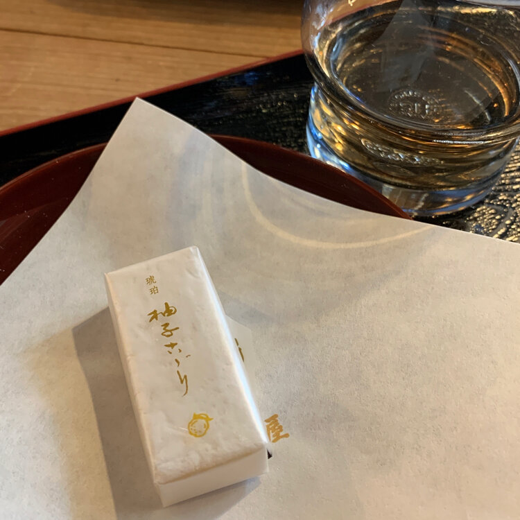 水無月を用意して頂く間に冷たいお茶と琥珀(ゆず)を頂き、本店同様京都らしいおもてなしにほっこりしました。