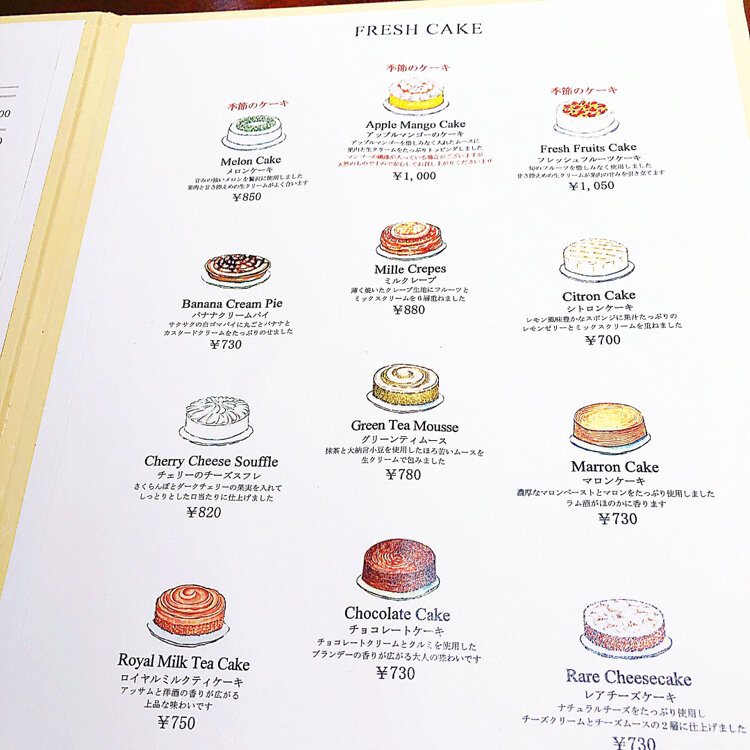 席に案内される前にお取り置き2カットお願いし、メロンが苦手なわたしはゆっくりメニューとショーウィンドウを見比べ、チェリー🍒のチーズスフレを注文しました。
