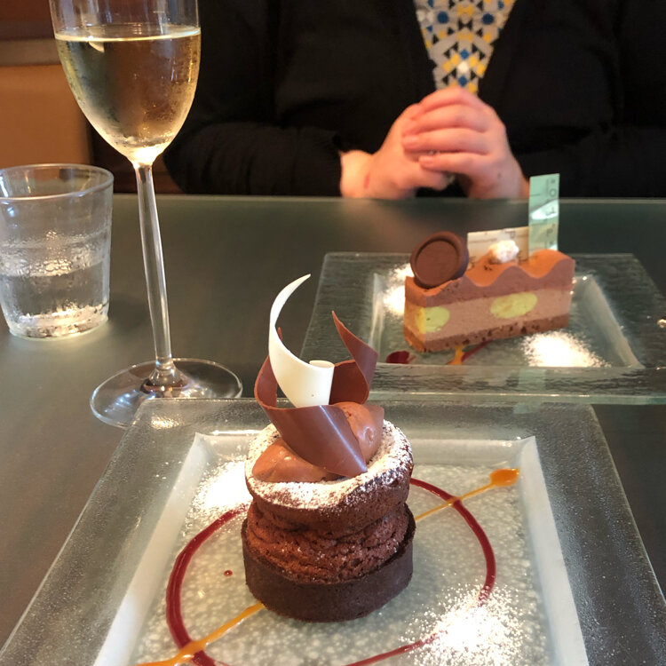 ショコラティエ パレ ド オールの美しくて美味しいケーキ。シャンパンとペアリングして、ご褒美タイムです。 実は1ターン目にショコラ3種とシャンパンのセットを頼んでました。 本当何個食べても飽きない、もたれない素晴らしいショコラティエ。 ここでカフェタイムすると何もかも頑張れます。