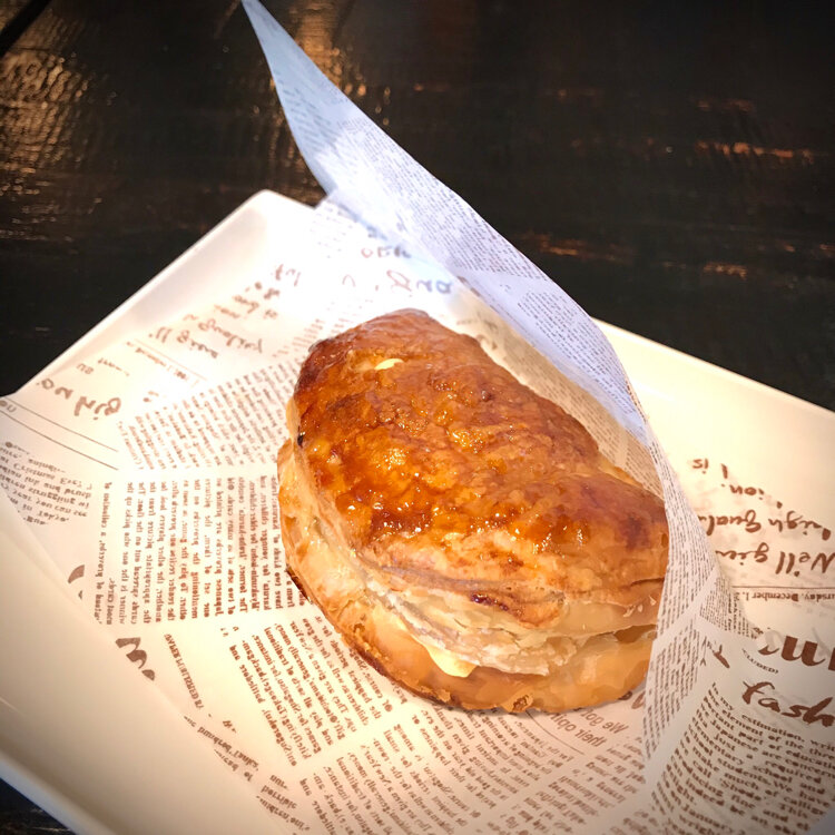 温めたサクサクバリバリのパイにたっぷりのリンゴとカスタードクリームがとろりの絶品です。