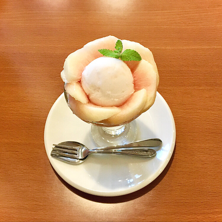 美味しいだけでなく、スライスされた桃が花びらのように盛り付けられているのもフォトジェニックでインパクトがある༄