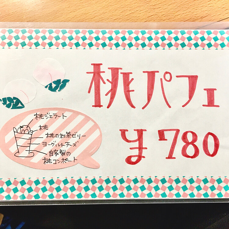 落ち着きのある店内で、Cafe推しである旬の桃パフェを注文🌟