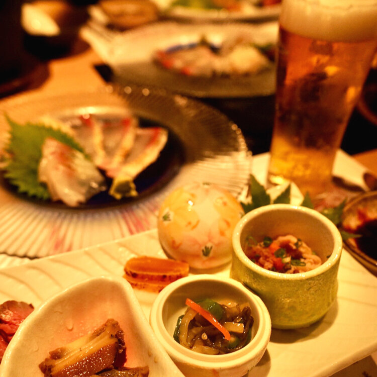 アワビの旨煮やカラスミ、ローストビーフなどが盛られた前菜とともに乾杯🍻