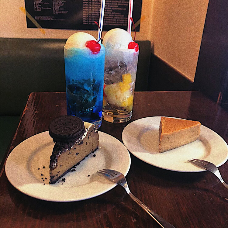 オレオケーキとメロンソーダ。深緑のソファがお洒落で夜はBARになるようです🍸