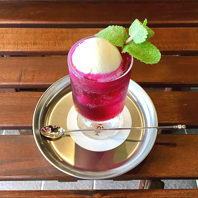 紫蘇の爽やかな香りがするソーダに乗ったアイスクリームが溶けるとクリーミー🌟暑い日には最高だし、さっぱりして休憩にはもってこい🍹透き通るような赤色もgood。今の時期だけ出回っている赤しそだけに、気になる方は早めのチェックを👍