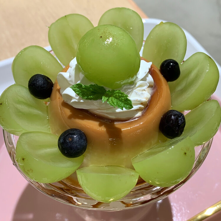 瑞々しいシャインマスカットはまさにほっぺが落ちそうな美味しさで、プリンは好みの柔かた具合でした。クリームは滑らかで甘過ぎず、ブルーベリーがポイントとなっていました。