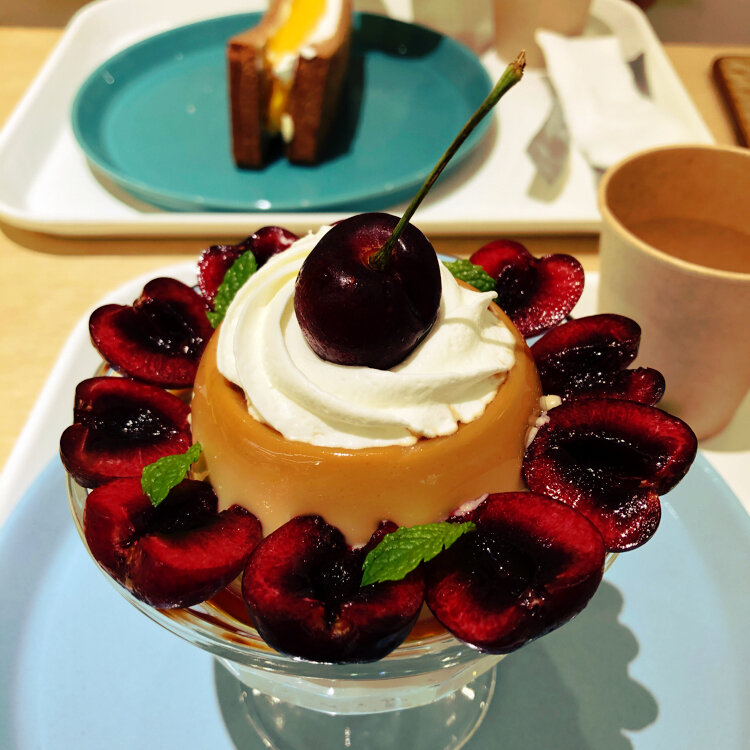 かき氷メニューが豊富で殆どのお客さんがオーダーしていましたが、プリンが食べたい気分だったので、季節のメニューからシャインマスカットのプリンアラモードを頂きました。