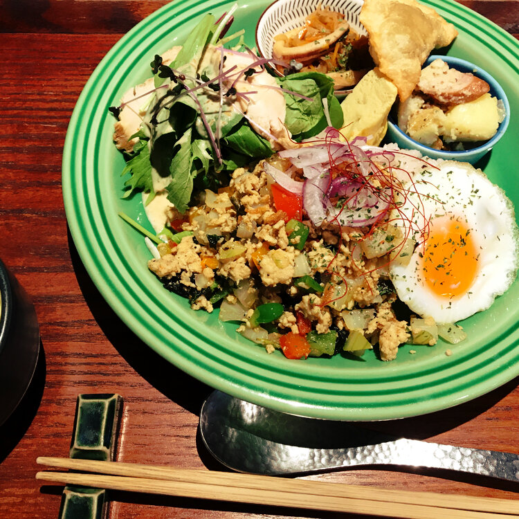 今回は、ガパオライスランチをいただきました。ランチプレートには3種類のお惣菜やサラダも載っていて見た目よりボリュームがありお腹がいっぱいになります。そうか、お料理の待ち時間にプリッツのサービスをボリボリ食べたからか。