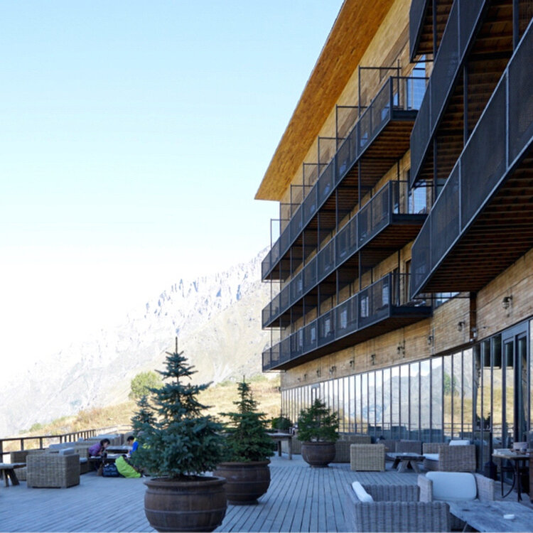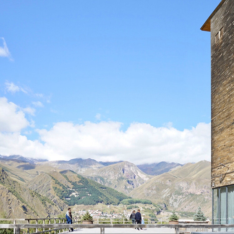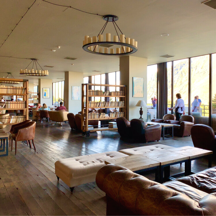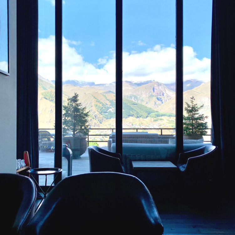 宿泊施設といえばゲストハウスが主流のカズベキで、唯一の大きなホテルがここ。首都トビリシにもあるデザイナーズホテルです。こちらには泊まらなかったけれど、本棚が並び雄大な景色が見れるというロビーは泊まらずとも一度は行く価値ありと聞いて、カフェしにやって来ました。