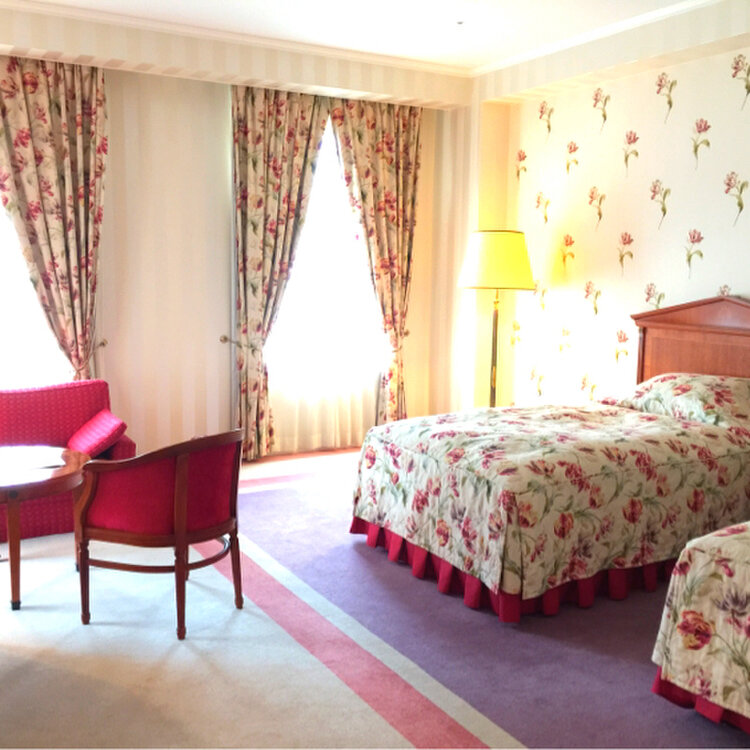 九州旅13 ホテルアムステルダム クラブフロア  クラブフロアのお部屋はスタンダードなツインでも40平米以上あるらしくてとても広々しています(*´꒳`*) ローラアシュレイのインテリアが基本形 アメニティもローラアシュレイでした 可愛い💕 テンション上がる〜☺️