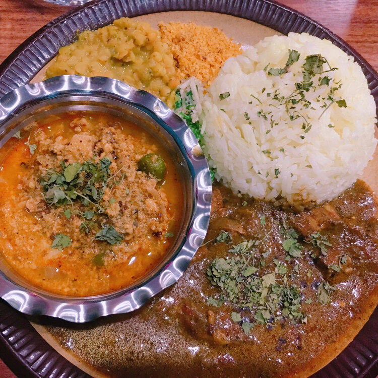 スパイスカレーが食べたくなって心斎橋へ。 カレーはしごしたかったけどなかなか食べられず、ようやくこのお店で食べられました。 3種盛りチョイス。カレーの名前は忘れだけど、どれも美味しかった!!