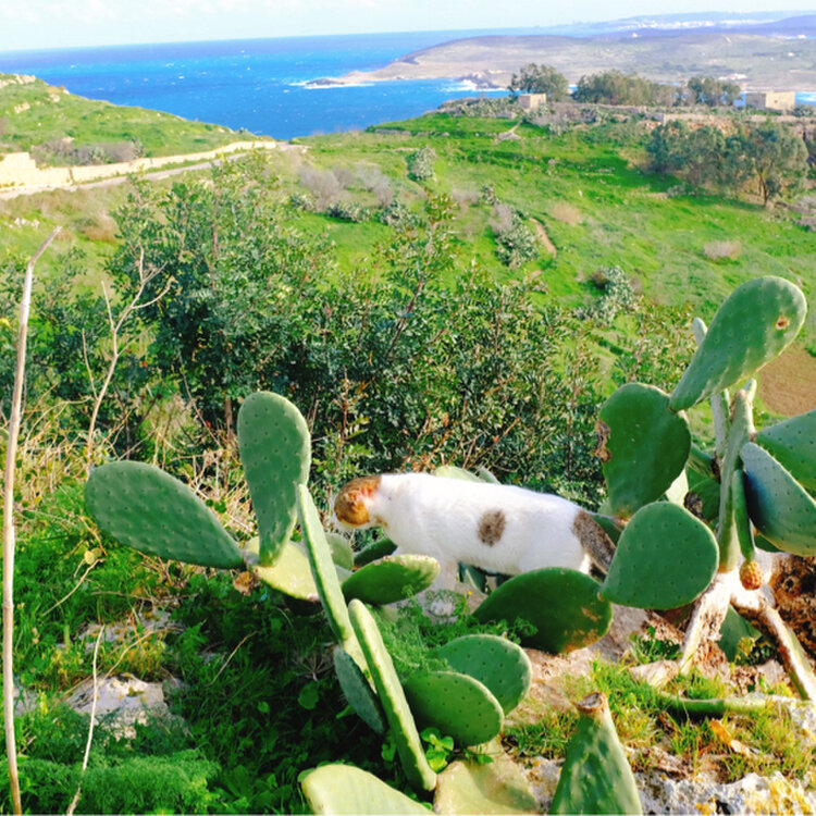 広々とした海に浮かぶ島々、サボテン、それに猫!なんともマルタらしい光景に癒されました。