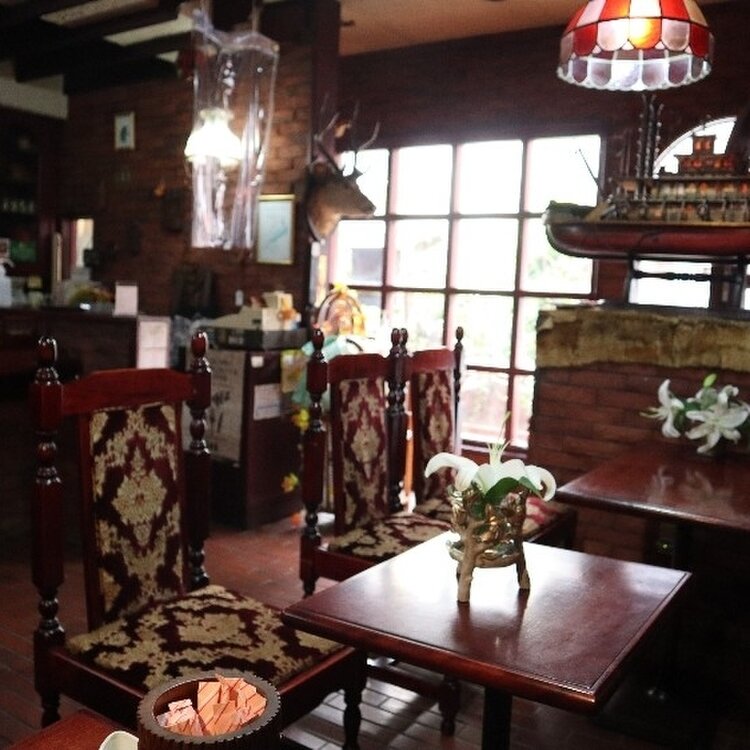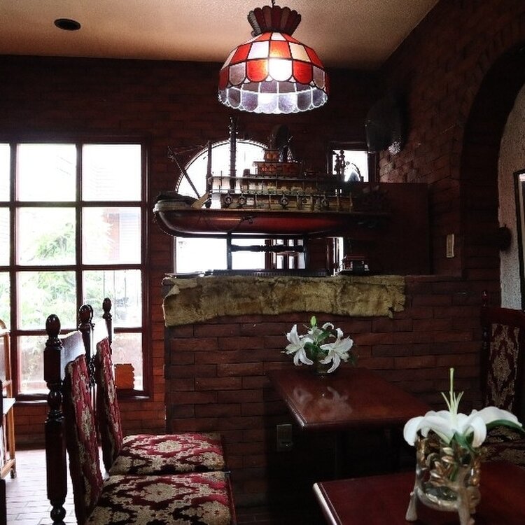 ビードロ布の良い部分を切り取って作った椅子やステンドグラスのランプ、カウンターの後ろの食器棚も1つ1つ丁寧に作られていて、とても素敵でした。