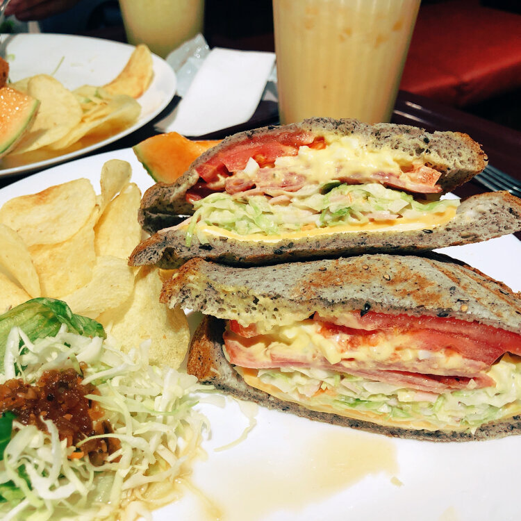 三びきの子ぶたで、サンドイッチランチ(今回はBLTチーズを黒ごまパン) 平日限定で、お好きなサンドに+350円でドリンク、サラダ等がついてお得です。 サンドはパンを4種類から選べます♪ 具材はショーケースに並んでいて、それを見て選ぶのも楽しいかもしれません。 ドリンクはフレッシュジュースも含まれていて、注文してからミキサーにかけて作ってくれます。 #わたしの街 #サンドランチ
