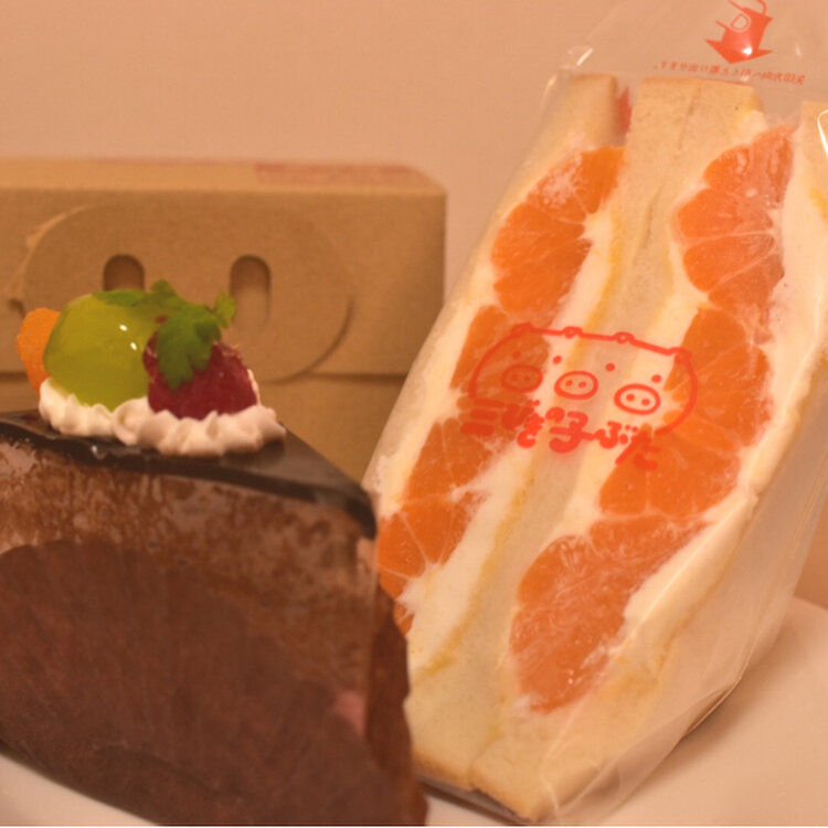 三びきの子ぶた その2 ケーキと、『おみかんのサンド』をお持ち帰り! 温室みかんがたっぷり入っていて、生クリームとマーマレードとの相性◎で美味しかった😍 #わたしの街 #フルーツサンド