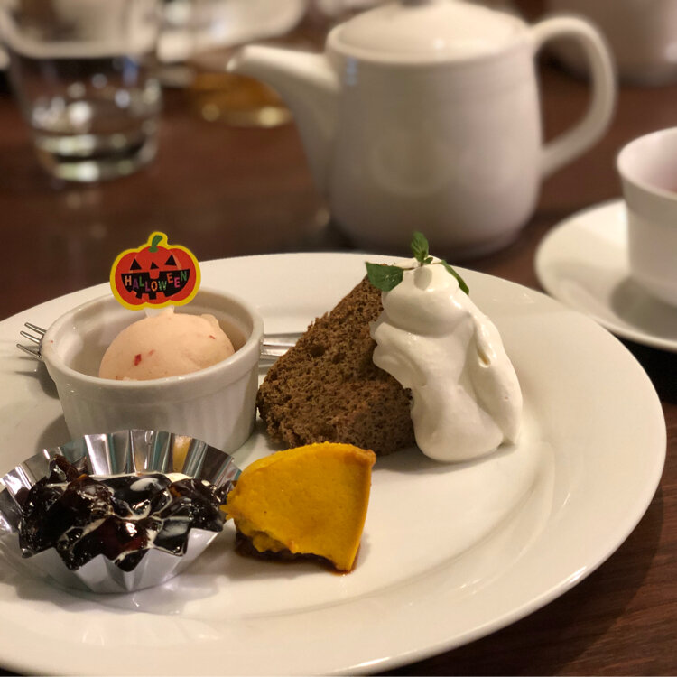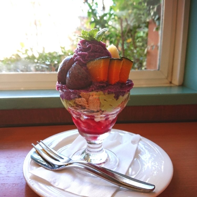 フルーツ王国のデザート。 秋はフルーツオフシーズンかと思いきや カボチャ、栗、お芋のミニパフェ。 やりよる! #山梨#甲府#カフェ#ナチュラルグレース#お芋と栗のパフェ#別腹なし