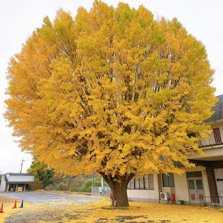 岡山県真庭市蒜山 旧八束村役場 まんまるイチョウ✨ 日本一美しいと言われる大銀杏(風神) ほんとにきれい、それ以外の言葉出てこないです。 お天気は良くなかったけど輝いてました🤩