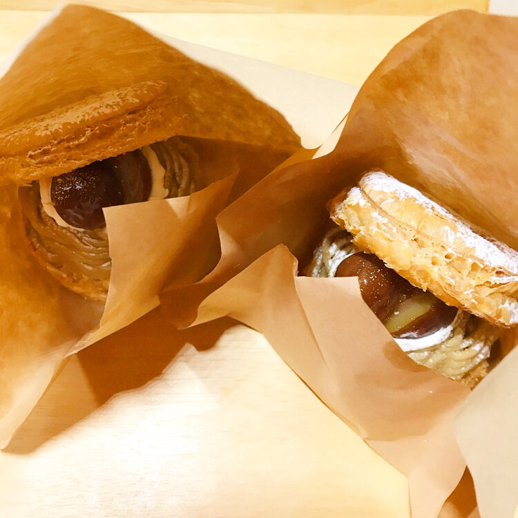サクサクのパイに国産栗のモンブランをサンドした大きなパイバーガー♡